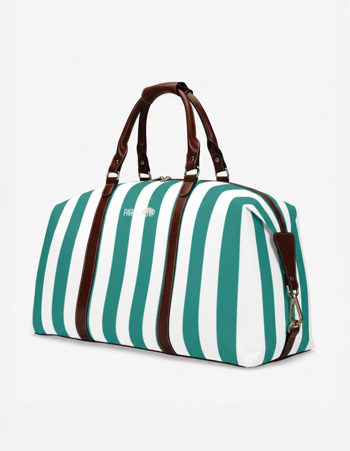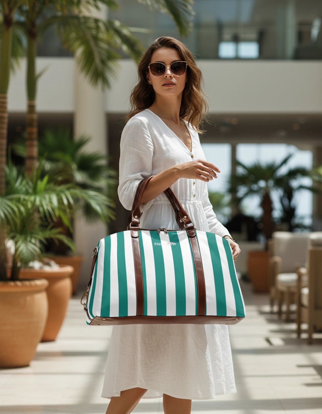 Man holding a striped teal and white bag in an airport terminal by PARADIS SVP